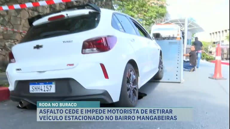 O asfalto de uma rua no bairro Mangabeiras, na região centro-sul de Belo Horizonte, cedeu e a roda de um carro ficou presa dentro de um buraco. Para a retirada do veículo, foi necessário a chamada de um reboque. Fonte: R7 – Minas Gerais