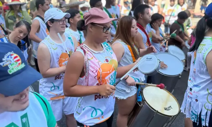 Maria Fernanda, de 21 anos, é um dos 70 ritmistas que puxam o bloco, afirmando o protagonismo de pessoas com deficiência no carnaval da antiga capital fluminense. Ela tem síndrome de Down, e é conselheira municipal titular de pessoas com deficiência no Conselho de Direitos Humanos da cidade. “Estou muito feliz”, disse a jovem.