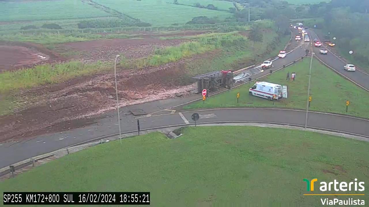 Um caminhão Mercedes-Benz colidiu contra um talude e tombou no km 172,8, sentido Norte, em Barra Bonita, por volta das 18h33 desta sexta-feira, 16 de fevereiro.