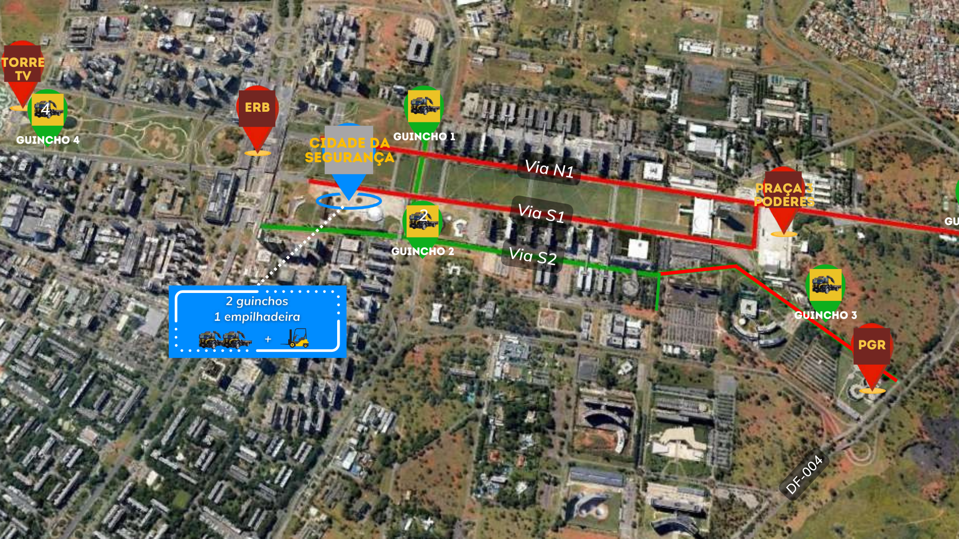 Das 5h às 16h de domingo, serão instalados três Pontos de Controle de Trânsito (PCTRANs) na via S2: o primeiro fará o fechamento do acesso ao túnel da Cúria da Catedral; o segundo, na altura do anexo IV da Câmara dos Deputados, para impedir o acesso de pessoas e veículos ao túnel do Itamaraty e desviar para a S3 os veículos que estiverem no sentido L4 sul; e o terceiro, no acesso ao SESI Lab, para permitir o estacionamento somente de táxis e viaturas.
