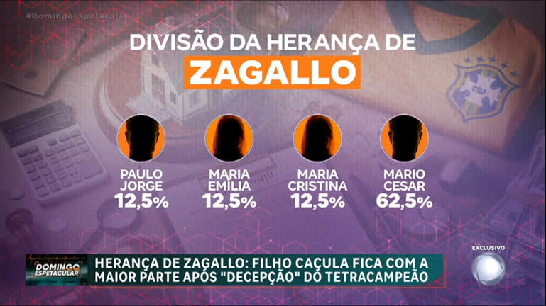 A herança milionária de Zagallo virou uma guerra em família. O Domingo Espetacular teve acesso ao testamento do tetracampeão e revela por que o filho caçula vai ficar com mais da metade da fortuna, além do que teria motivado a profunda decepção de Zagallo com os outros três herdeiros.