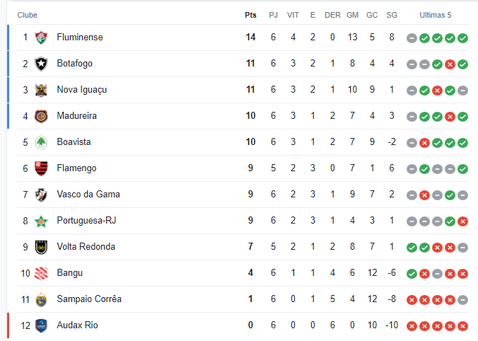 O Boavista, por sua vez, encara a Portuguesa e pode chegar a 13 pontos se vencer. Dessa forma, para o Fluminense, também seria interessante um tropeço da equipe de Saquarema. Lembrando que o Flamengo ainda tem um jogo a menos com o Volta Redonda. Confira a tabela: