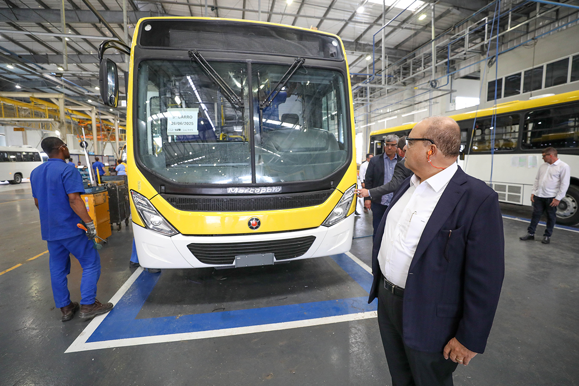 O governador Ibaneis Rocha visitou as instalações da fábrica da Marcopolo em São Mateus (ES), de onde vão sair os 444 novos ônibus Torino Euro 6, que vão integrar a frota do transporte público do Distrito Federal. Ao todo, 207 unidades serão entregues ainda em 2025, e outras 237 estão previstas para o próximo ano, todas pertencentes à Viação Pioneira.