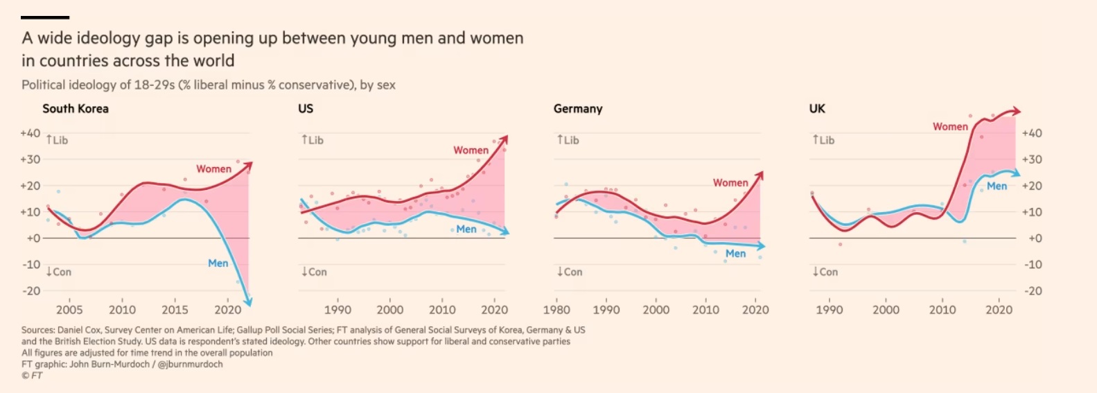 Historicamente, pessoas dos dois sexos com idades próximas compartilhavam um alinhamento ideológico semelhante. Agora, porém, o quadro mudou. Alice Evans, pesquisadora da Universidade Stanford, afirmou que um dos fatores para o cenário é o aumento do feminismo no mundo e uma reação natural do público masculino a isso.